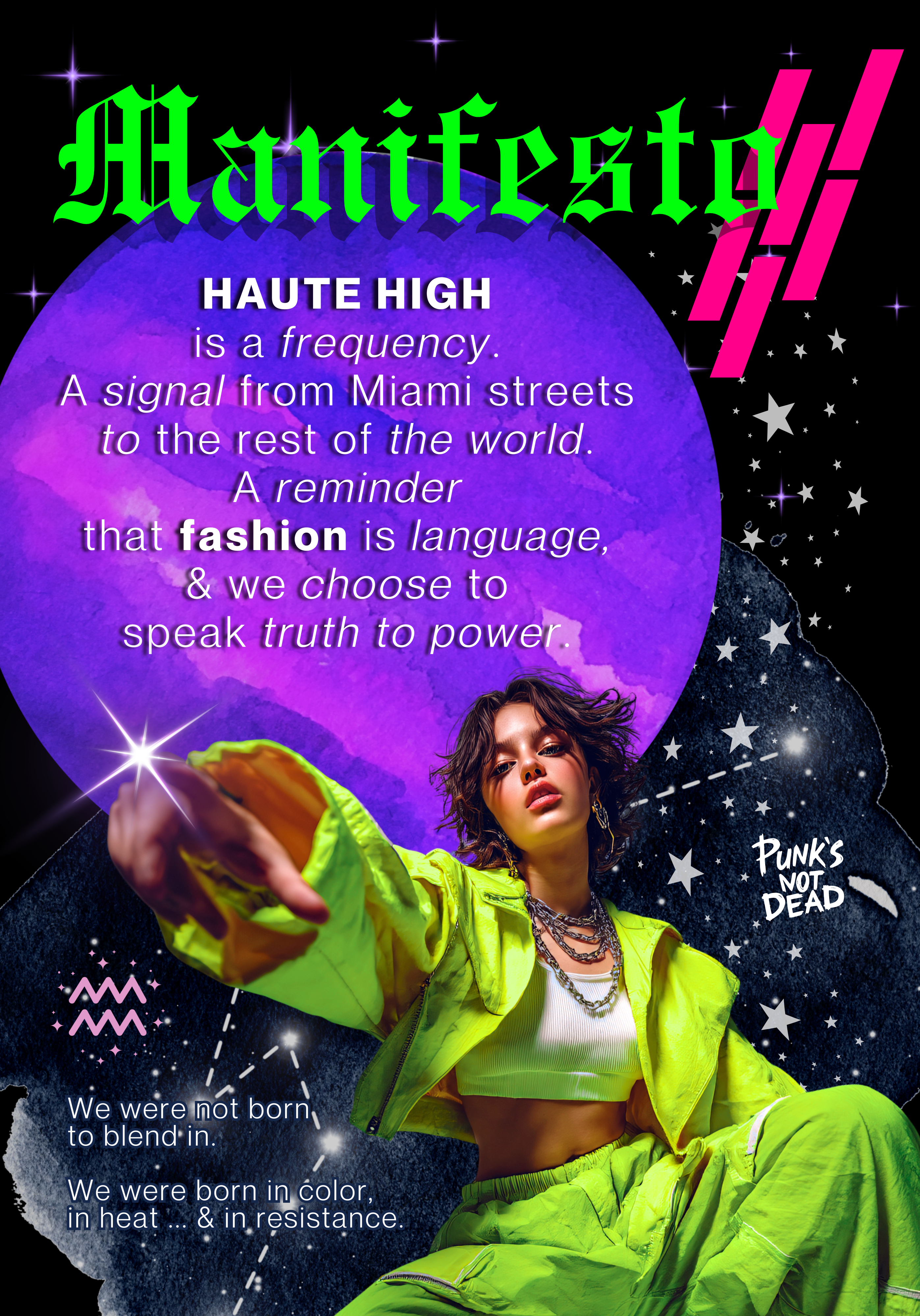 But we're more than that. We're a lifestyle brand, and a movement. HAUTE HIGH is where fashion gets lit and culture stays loud. Our brand was born in Miami and it's rooted in Community. Our brand is for the dreamers, the disruptors, and the high-frequency fam. We mix art, weed, and political soul into every stitch, repping feminist fire, Latinx power, and tropical flavor with every drop.